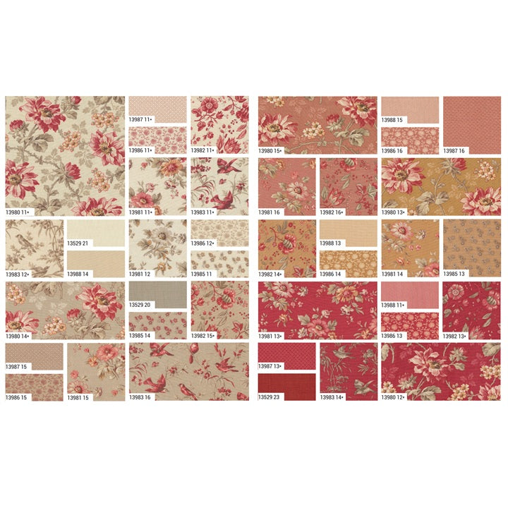 'Joie de Vivre is a soft and subtle interpretation of early 19th century French prints and is evocative of an old French parlour room or a lady's dressing room. The larger multi-coloured floral prints lend themselves to floral fussy cutting - a wonderful way to create pretty appliqués and hexagons. Out of all of the collections we have done in the past fifteen years with Moda, this is our very favourite and it will blend perfectly with our past collections.'