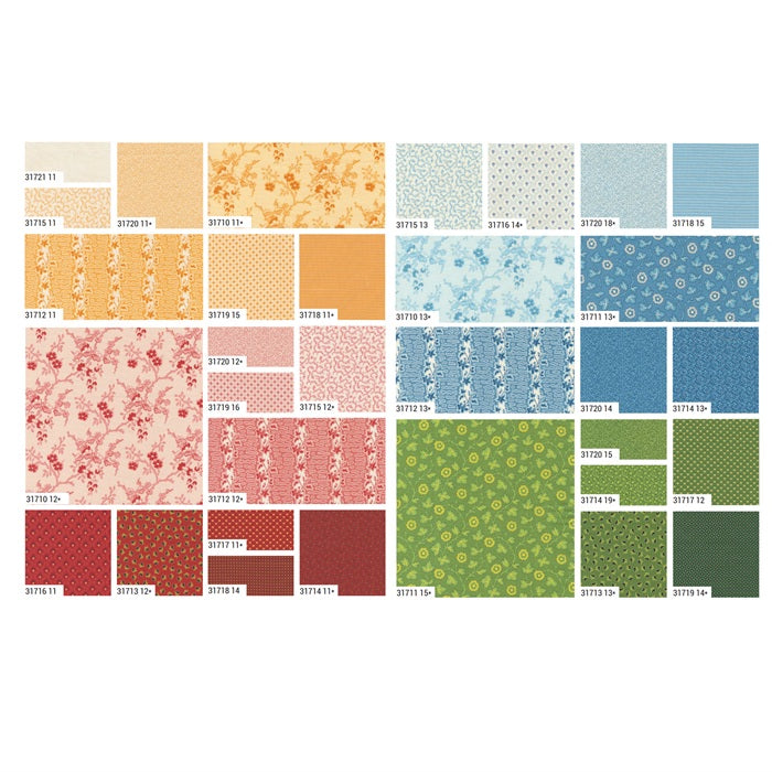 42 fabric squares of 2.5 x 2.5 inches (6.4 cm) from the pretty ‘Sally's Stitches’ collection by Betsy Chutchian.